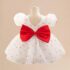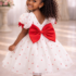 Les manches bouffantes en tulle léger donnent du volume sans alourdir la silhouette, tandis que la ceinture rouge satinée structure joliment la taille. À l’arrière, un grand nœud rouge soigneusement formé apporte une finition spectaculaire et très appréciée lors des cérémonies.